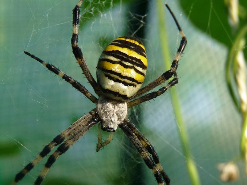 September 2025: Wasp spider [Argiope bruennichi] (Wespenspinne): I found this big, colorful spider in my little tomato greenhouse. In the upper part of the greenhouse there are often some insects trapped because they fly upwards or towards the light but there is no opening at the top. It seems that this spider takes advantage of this circumstance because it built its web just above the door.