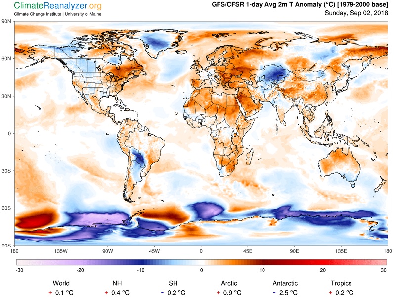 September 2nd, 2018: 1-day average 2m Temperature Anomaly in °C (1979-2000 base) Source: Climate Reanalyzer (http://cci-reanalyzer.org), Climate Change Institute, University of Maine, USA.