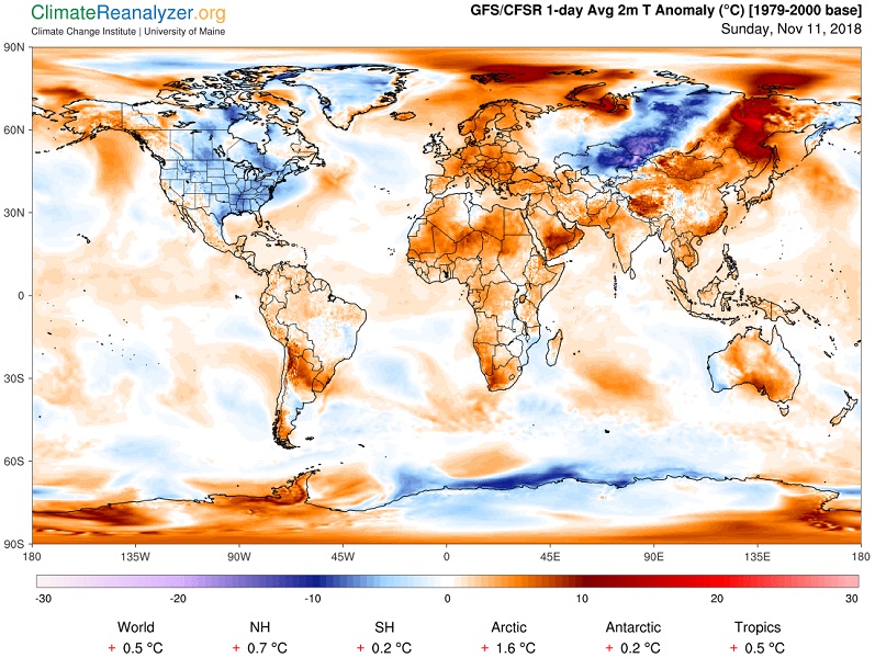 November 11th, 2018: 1-day average 2m Temperature Anomaly in °C (1979-2000 base) Source: Climate Reanalyzer (http://cci-reanalyzer.org), Climate Change Institute, University of Maine, USA.