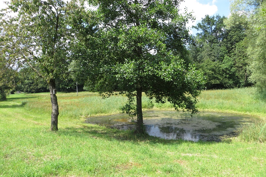 Vegetation: Ein Teil vom Gras wurde gemäht (auch um den Weiher), das Schilf ist weiter gewachsen, viele blühende Mädesüss, im Weiher hat es recht viel Algen und das Wasser ist ziemlich trüb