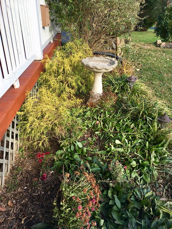 We have had fairly warm and dry conditions in the Washington, D.C. Region during the month of October. As you can see, our grass is a little dry, but it isn’t too bad. We have had a few frosts, but not enough consistent cold weather to kill off the plants. The red and purple flowers are mums, which do very well in this area in the fall. We are also seeing the green leaves of my Shasta daisies and my Black-Eyed Susan plants. My lirope plants are beginning to turn brown at the ends.