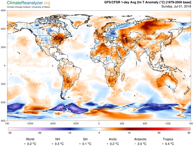 July 1st, 2018: 1-day average 2m Temperature Anomaly in °C (1979-2000 base) Source: Climate Reanalyzer (http://cci-reanalyzer.org), Climate Change Institute, University of Maine, USA.