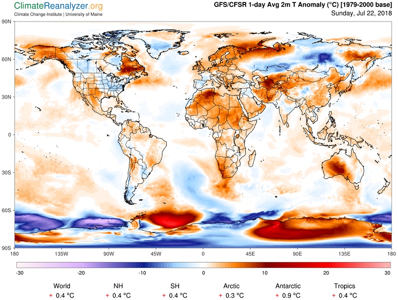 July 22nd, 2018: 1-day average 2m Temperature Anomaly in °C (1979-2000 base) Source: Climate Reanalyzer (http://cci-reanalyzer.org), Climate Change Institute, University of Maine, USA.