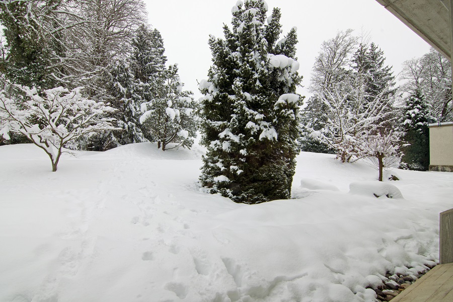 Nach längerem unbeständigem und wechselhaftem Wetter hat es ergiebig geschneit. Der Garten ist mit einer dicken geschlossenen Schneedecke belegt.