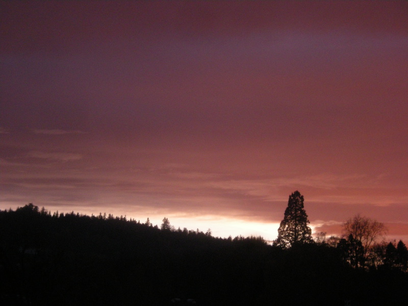 Just before sunset the sun colors the layer of altocumulus purple from below which gives an unusual scenery.
