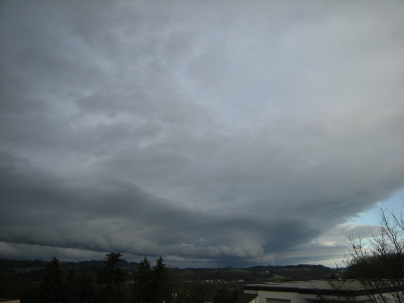 Sudden change from blue sky to storm: the storm front arrives.