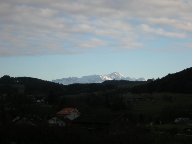 Green lowlands and white mountains on Christmas day.