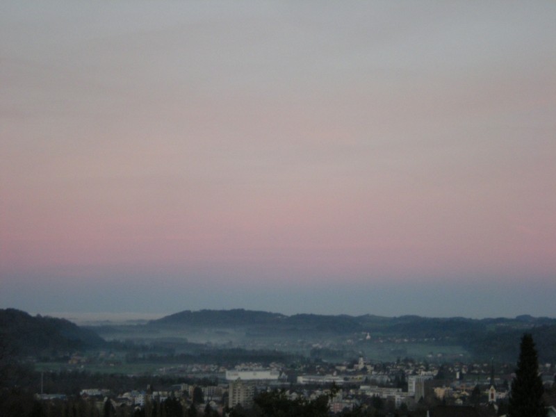 Sometimes the sky opposite to the sun is reddish, too, like this evening sky towards east with some fog laying in the lower Thur valley (horizon left).