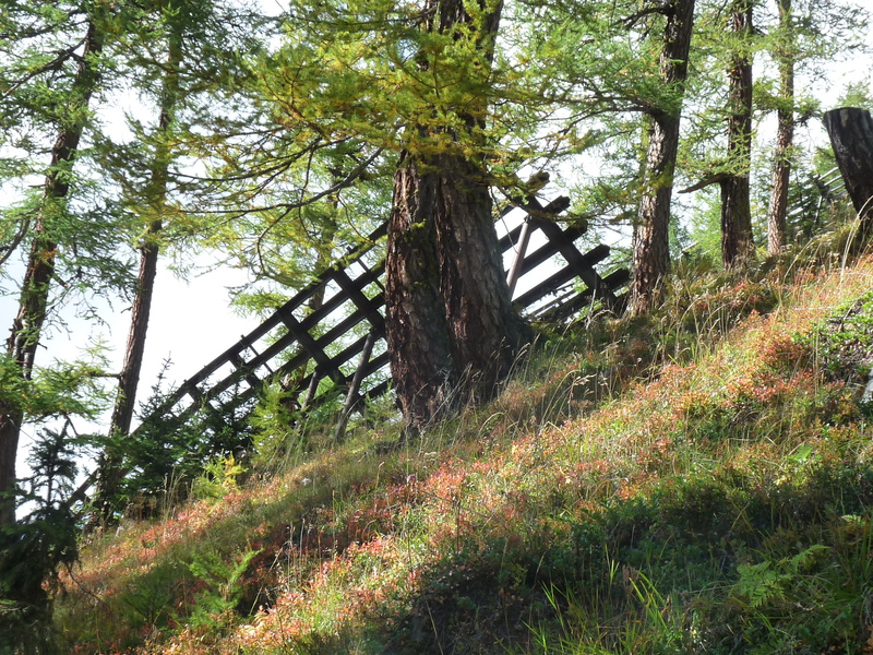In addition to the trees, metallic avalanche barriers prevent this steep slope and the village down in the valley from destruction.
