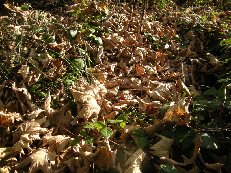 (Use the player above.) Here some maple trees have lost all their leaves already. On a mild windy day the leaves make this typical sound if you walk through it.