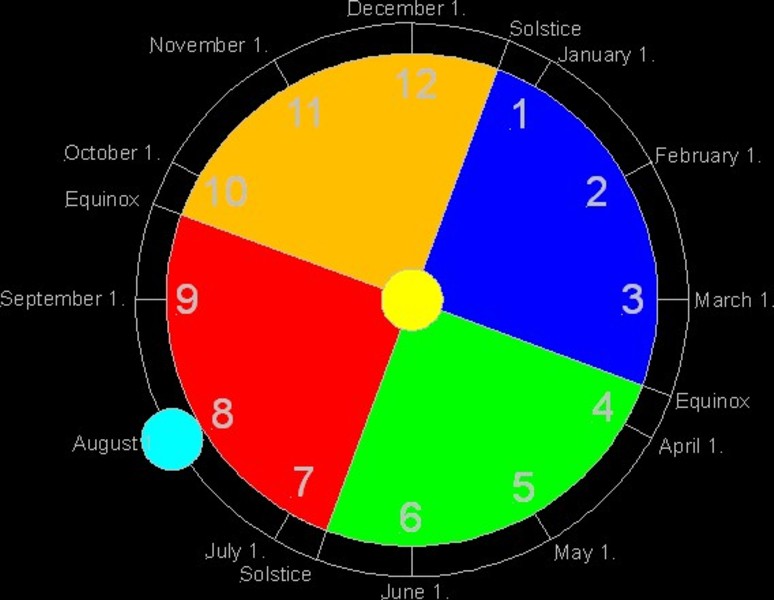 This graphic shows the Earth's postition on its orbit around the sun on August 1st. After about 80 days with little change in daylength there will be more evidence of our continuous flight around our star: In Central Europe sunrise will be 44min later and sunset even 54min earlier, so daylength will decrease by 1h 38min in August (some plants will already show a response to this seasonal change) due to the change in the sun's seeming orbit: It will seemingly move 10° south in August which also means that sunrise and sunset is significantly more to the south (northern hemisphere) / to the north (southern hemisphere). (The sunlight's angle of entry at noon will change by almost 10° everywhere on Earth in August.) Next month we will already reach the Equinox point with 12h day / 12h night, where / when the difference from day to day is at the maximum and we fly into the colder (northern) / warmer (southern hemisphere) half-year.