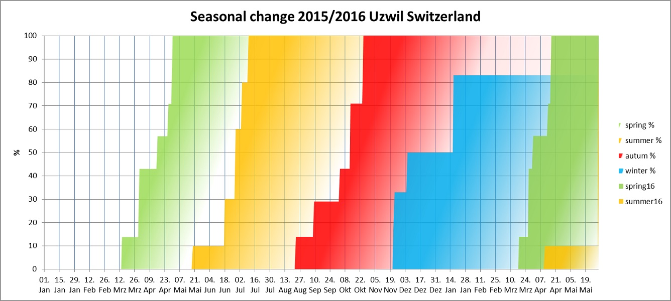 Seasons im my region (SIMR) at the end of April 2016: We have 100% spring and already 10% summer in my region because of an early thunderstorm on April 11th! This graphics shows the linear sequence of the seasons in my region.