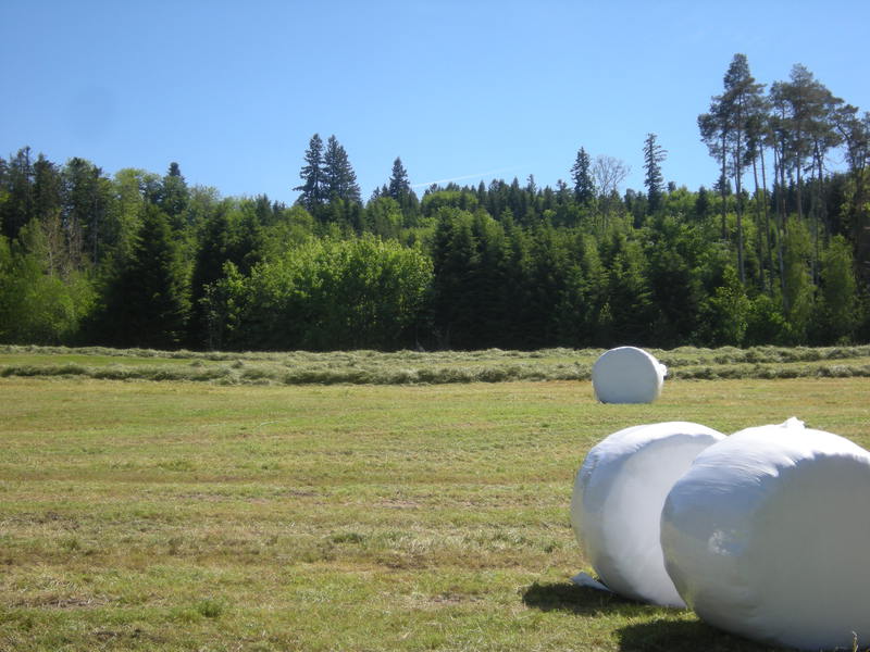 Many farmers don't dry the hay completely any more but wrap it into plastic and let it ferment. At the beginning of June the weather would have allowed making hay traditionally...