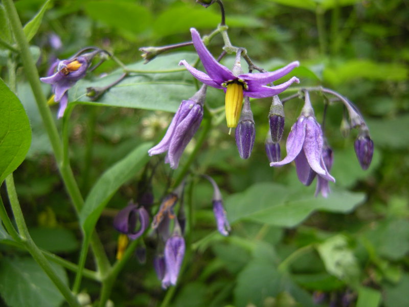 Use the player: Listen to the bees and later to a blackbird [Turdus merula] (Amsel), a chiffchaff [Phylloscopus collybita] (Zilpzalp) and a blackcap [Sylvia atricapilla] [warbler] (Mönchsgrasmücke). / The picture shows the blooms of the bittersweet [Solanum dulcamara] (Bittersüsser Nachtschatten).