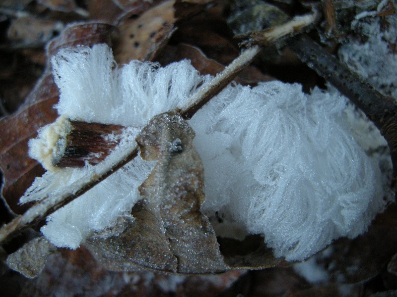 January 2016: Hair ice (Haareis): For the first time in my life I found some hair ice in our forest: In a shady part with some beeches [Fagus] and temperatures slightly below 0°C I wondered whether I saw a snowball in the brown fallen leaves - it was hair ice! Hair ice grows after spores of the golden / yellow jelly fungus [Tremella mesenterica] have colonised barkless beech wood, if temperatures are between -0.5 and -4°C and humidity is about 100%. When liquid emerges from the wood's pores piliform ice builds up to 8cm long. Snowfall, rain or touch makes them crumble to brownish drops. Haareis entsteht, wenn Pilzsporen des Goldgelben Zitterlings auf vermodernde, rindenlose Buchenäste gefallen sind, der Pilz im Holz aktiv ist, die Temperatur zwischen -0.5 und -4°C und die Luftfeuchtigkeit rund 100% beträgt. Beim Austritt von Flüssigkeit aus den Holzporen entstehen bis zu 8cm lange Eisfäden. Bei Schneefall, Regen oder Berührung zerfallen die Eisfäden zu bräunlichen Tropfen.