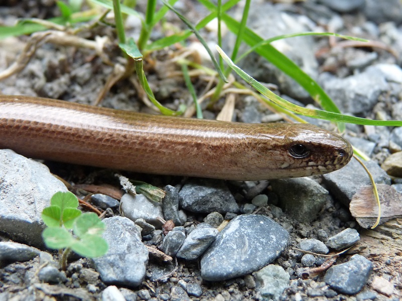 August 2022: Blindworm or Slow worm [Anguis fragilis](Blindschleiche): This was an unexpected encounter and good luck that I became aware of it before I was too close as the blindworm was in the middle of the forest path. I could get closer very slowly and take pictures, observe it and even take a short film when it crossed the path and disappeared into the covert. It is a reptil and looks like a snake but it belongs to the lizards (although latin anguis = snake!). And it isn't blind at all, it can even move its eyelids. The Slow worm can shed its tail to escape predators. The tail doesn't regrow to its full length, but still, it regrows. After 11-14 weeks they bring about in August around 10 young slow worms to the world. They are ovoviviparous which means that the eggs are breeded in the maternal body and the youngs hatch at birth. What an amazing creature!