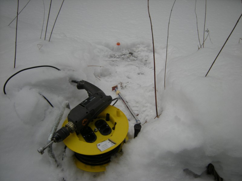 We drilled a hole into the ice of our school pond to insert a frost tube and the prototype of my new ice thickness meter.