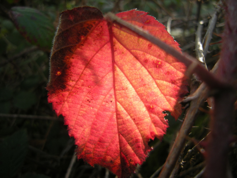 Autumn leaf of a blackberry [Rubus fruticosus] (Brombeere) in the soft autumn evening sun.