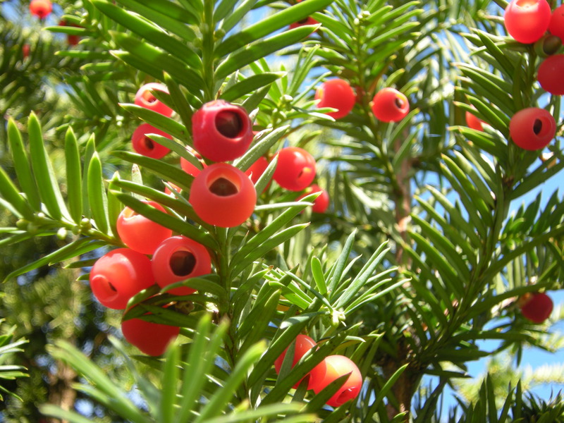 More and more yew tree [Taxus baccata] (Eibe) berries turn red (and are soon eaten by the birds). They look wonderful in the autumn sun.