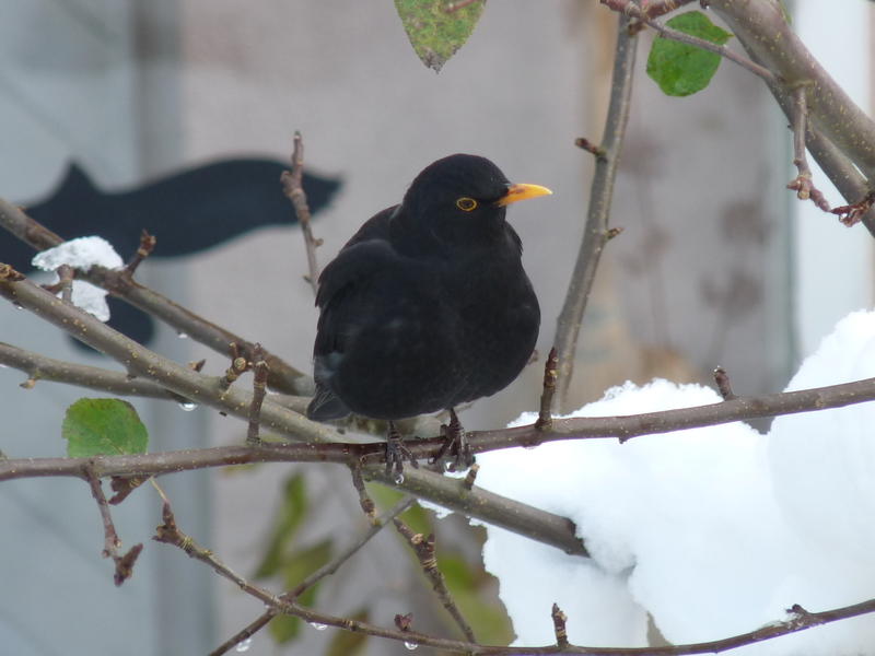 This blackbird seems to be astonished because of the combination of green leaves and snow.
