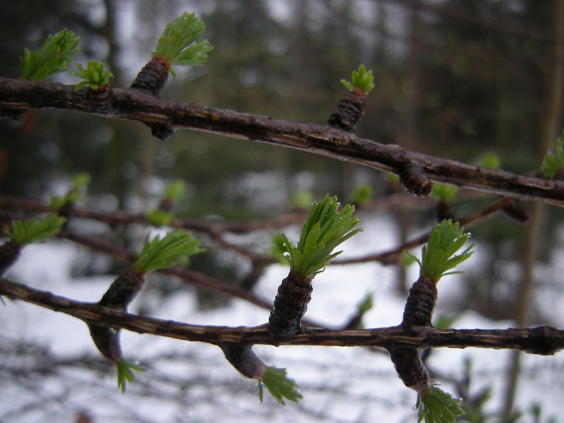 Larch needles: About the same stage of development on March 28th 2012 and on April 21st 2013.