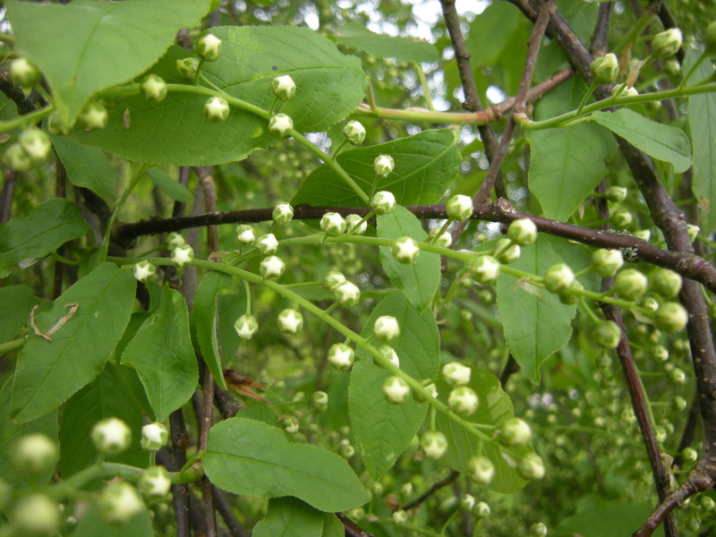 As well as others the (European) bird cherry [Prunus padus] (Traubenkirsche) will come into bloom as soon as we get some balmy days. Auch die Traubenkirsche wird blühen, sobald wir ein paar warme Tage haben werden.