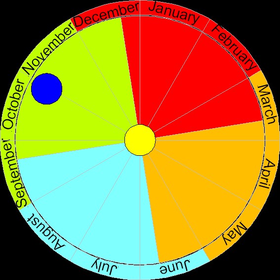 This graphic shows the Earth's postition on its orbit around the sun on November 1st with colors that indicate the southern hemisphere's seasons. I have simplified the picture a bit by writing the months' names into the sectors (the month's colors indicate how seasons are popularly seen) and by putting January, the first month, between 12 and 1 o'clock. Thereby the first hour is the first month, the second hour is the second month, and so on. This is more logical than the previous picture. Again I must say that it's very useful that a year has the same number of months as a dial has hours: 12.