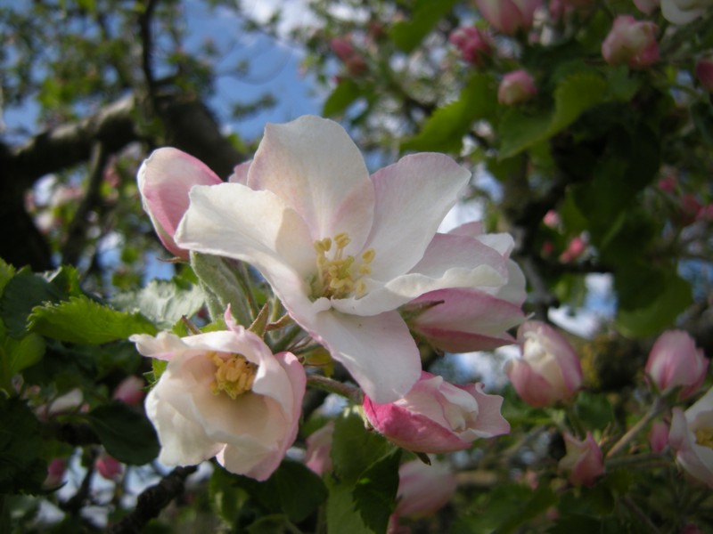 May 2014: The April weather paused in mid April when we had some sunny mild days and an early apple tree blooming. This old standard fruit tree had thousands of blossom buds, however, as two days after this picture we had some April snow, it turned out that the buds that opened later were at an advantage.