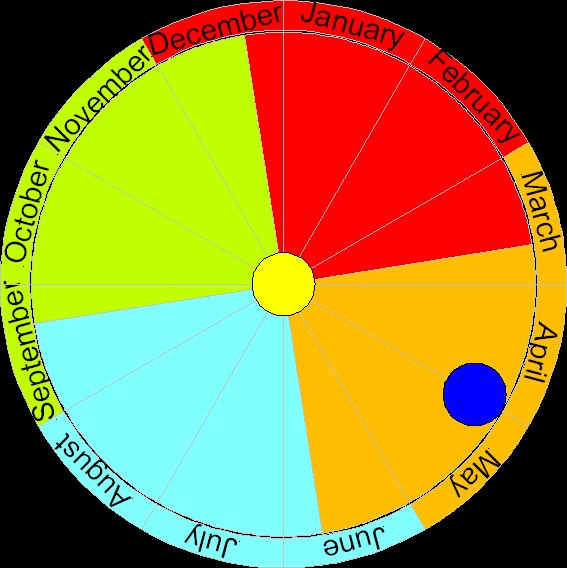 This graphic shows the Earth's postition on its orbit around the sun on May 1st with colors that indicate the southern hemisphere's seasons. Astronomically seen they are almost in the middle of autumn. May is perhaps the typical month of autumn all over the southern hemisphere: it's full autumn now after a longer autumnal period in mid latitudinal sites, and a short but intense autumn begins now in polar regions. Popularly seen winter will begin next month. The changes in the sun angle decrease: the declination goes from about 15° to 22° in May, and will always be between 22° and 23.4° in June. It will be mid August when the angle will be 15° again: a change of less than 9° within more than 3 months. In the following 3 months the angle will change by 35°! This also means that all places on the southern hemisphere will have quite a stable low incoming solar energy for the next three months, which means that this hemisphere will be continually cooled down. It would be interesting to know how much energy is exchanged within the hemishpere during this time and how much perhaps even across the equator.