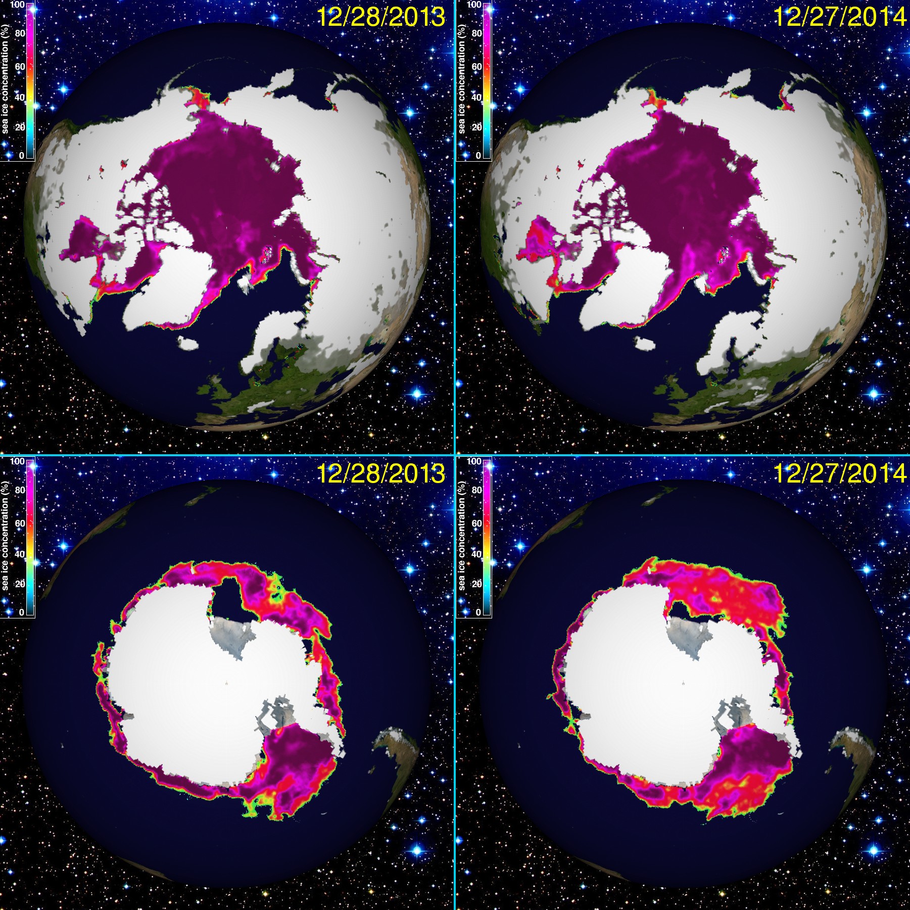 2013-2014 compare: Arctic: This year we observe more sea ice between Svalbard and Nowaja Semlja and north of Svalbard, but less in the Bering Sea. More snow last year in North America and Asia, more snow this year in Scandinavia.