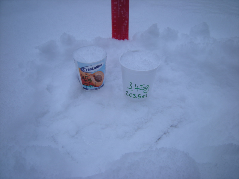 Density determination of fresh snow: The snow board shows that we have about 5cm of fresh snow. To have a check measurement I filled two different cups with fresh snow. Before I weighed the empty cup (-> weight in g), filled it with water, weighed again, subtracted the cup's weight and got the volume in ml=cm3. With a waterproof pencil I wrote both, the weight and the volume, on the cup.