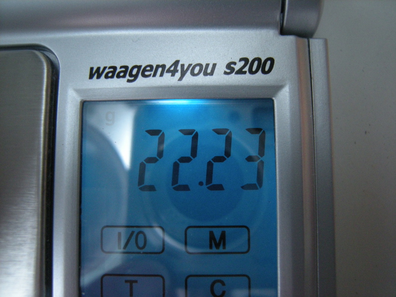 The reading is 22.23g (= snow + cup)