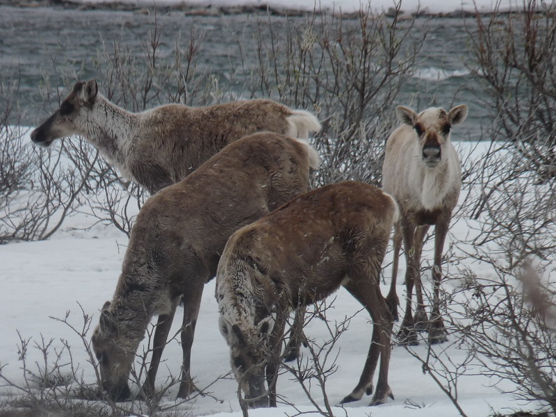 When we had diner at camp 4 a group of caribou came very close to us and it started to snow. They were licking minerals that aggregated on ice along the Aichilik River. Während dem Abendessen in Camp 4 begann es zu schneien und eine Gruppe von Karibus kam sehr nahe. Sie leckten Salze, die sich auf dem Eis im Aichilik River ablagerten.