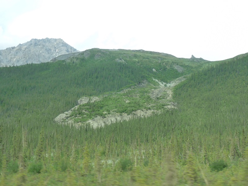 This part of the slope towards the Dalton Hwy contains ice that is thawing and therefore not stable any more - so it's moving like a landslide in slow motion slowly towards the road and buries everything ahead of it. Dieser Teil des Abhangs enthält Eis, das am Auftauen und deshalb nicht mehr stabil ist. Deshalb bewegt es sich wie ein Erdrutsch in Zeitlupe langsam auf die Strasse zu und begräbt den ganzen Wald unterhalb unter sich.