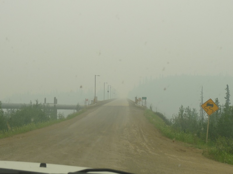 Dalton Highway southbound: Bridge over the Yukon River: poor visability due to the wildfires' smoke: you even can't see the other end of the bridge! Die Sicht auf dem Dalton Hwy war so schlecht, dass man nicht einmal auf die andere Seite der Brücke über den Yukon sehen konnte!