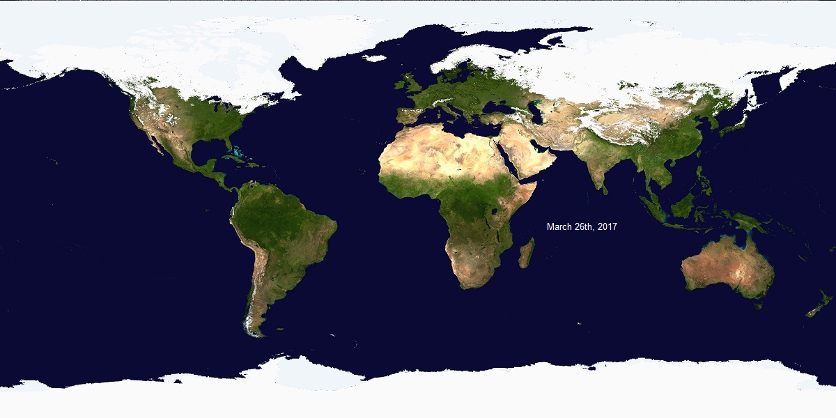 March 26th, 2017: World Wide Daily Snow and Ice Cover Map Light blue areas indicate the sea ice extent, white colors indicate all other areas covered in snow. The cryosphere which are areas covered by ice, snow, glaciers, or permafrost is an extremely dynamic part of our global system. Changes in seasons & climate bring great changes to the Earth's cryosphere.