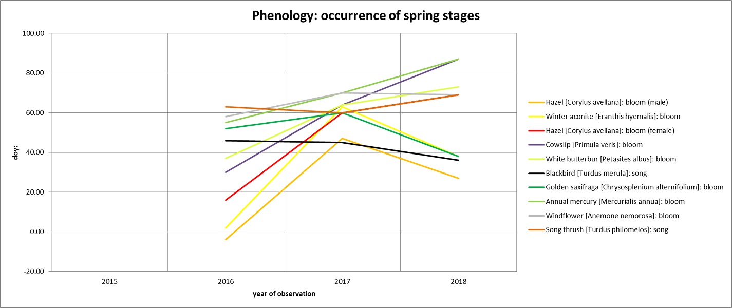 This diagram helps compare the occurrence of phenological spring stages. "Bloom" means first few fully open flowers, not that the plant was in full bloom already. There is no general rule, development depends on the species and the circumstances: E. g. the golden saxifrage was earlier than last year because it could handle the second cold spell easier than others. The white butterbur originally was earlier but was hindered, some plants even damaged by the cold spells. The cowslip would have been earlier than 2017 but was stopped by the second cold spell. The windflower was ready and could await the end of the cold spell without damage and finally opened around the same doy as 2017. The birds seem to behave differently: resident birds as the blackbird rather depend on regional factors as day length (and less on temperature as it seems) whereas migratory birds rather depend on supraregional factors which trigger migration. The song thrush is a partial migrant in my region.